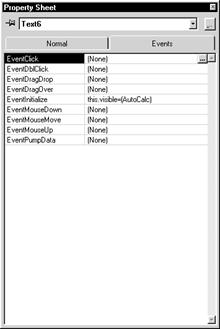 Getting back to our example above, the "EventInitialize" for Text6 shows some code "this.visible=(AutoCalc)". This VBScript shows that the text6 text object will only be visible if AutoCalc is on. AutoCalc is a global variable set by CHEMCAD when in AUTOCALC mode.
