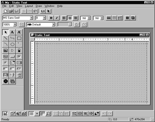 This displays the screen in run mode. Run mode means all visual basic scripting is active, so the screen performs much like it will in CHEMCAD. In order edit the screen, we must enter Edit mode. To do this, go to the "Layout" menu and select "Edit". The screen will change appearance to indicate you may now edit the dialog box:
