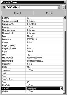 Edit Double Box objects are able to store floating-point double precision numbers and pass them to CHEMCAD through the unitop array. EditDblBox1 is set to pass its data through the first member of the array. This is identified in the Screen Builder as the valueID=Double001.