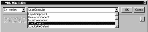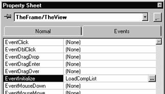 Open the properties of TheView by double clicking on the dialog in edit mode. Go to the "Events" tab, and double click on "EventInitialize". Set this to "C++ Action" and "LoadCompList" as shown: