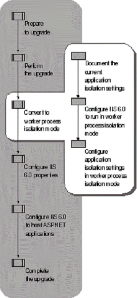 The process for upgrading an existing IIS server hosting IIS Web sites and applications includes preparing for the upgrade, as well as performing the upgrade. Upon completing the upgrade process outlined in this chapter, you can then configure IIS 6.0 to run your applications in worker process isolation mode. Lastly, if the newly upgraded IIS 6.0 server hosts existing ASP.NET applications, you must configure IIS to use the proper version of the Microsoft .NET Framework for these applications.