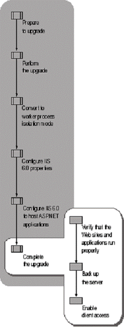 At this point in the process, your Web sites and applications have been upgraded on the server. Also, the IIS 6.0 properties have been configured so that you are now ready to verify that the Web sites and applications are running properly. After you confirm that the Web sites and applications are running properly, you can back up the Web server and enable client access. When you complete these steps, the upgrade process is complete.