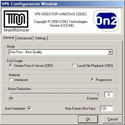 This section explains the settings and options in the "General" properties sheet of the VP6 Configuration dialog box. For more information, see "Suggested Compression Settings" on page .