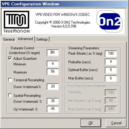 This section explains the settings and options in the "Advanced" properties sheet of the VP6 Configuration dialog box. For more information, see "Suggested Compression Settings" on page .