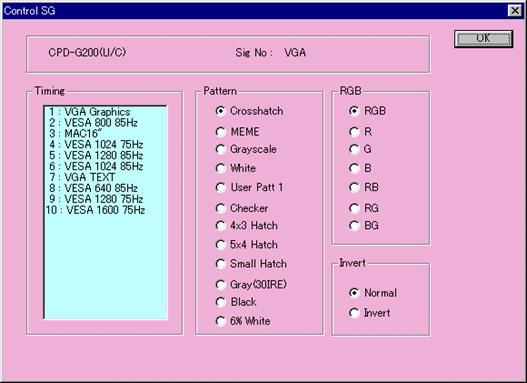 When the mode is selected, the signal generator will be programmed for the correct frequencies for that mode. The pattern displayed on the screen will be the default pattern consisting of a white crosshatch. Then, you can select a different pattern and gun setup. You can make the following selections (Note: not all generators support all selections. The generator will be programmed to come as close as possible) :