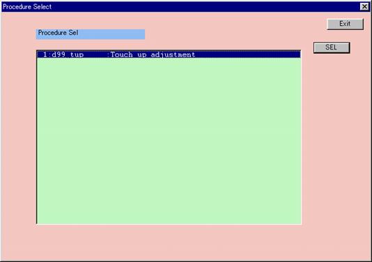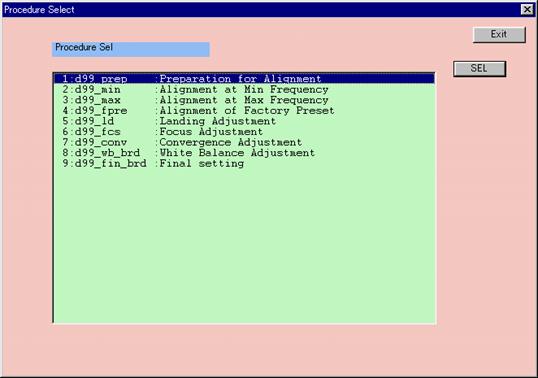 When you select Procedure from the Adjustments menu, you will be presented with a list of available adjustment procedures in a list box. Select one by double clicking the left mouse button or push SEL button.