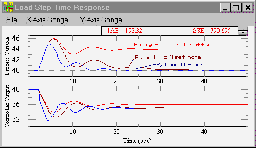Notice that the offset (deviation from set-point) in the time response plots is now gone. Integral action has eliminated the offset. The response is somewhat oscillatory and can be stabilized some by adding derivative action. (Graphic courtesy of ExperTune Loop Simulator.)