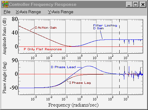 With a PID controller the amplitude ratio now has a dip near the center of the frequency response. Integral action gives the controller high gain at low frequencies, and derivative action causes the gain to start rising after the "dip". At higher frequencies the filter on derivative action limits the derivative action. At very high frequencies (above 314 radians/time; the Nyquist frequency) the controller phase and amplitude ratio increase and decrease quite a bit because of discrete sampling. If the controller had no filter the controller amplitude ratio would steadily increase at high frequencies up to the Nyquist frequency (1/2 the sampling frequency). The controller phase now has a hump due to the derivative lead action and filtering. (Graphic courtesy of ExperTune Loop Simulator.)