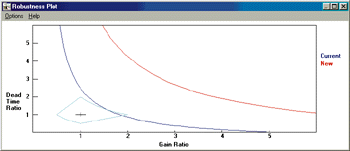 The robustness plot (Figure 2) is an analysis tool. It shows how sensitive (or robust) the loop is to process gain or process deadtime changes. Robustness plots graphically show the tradeoff between tight tuning and stability. Use the robustness plot to quickly analyze the stability (sensitivity or robustness) of a loop.