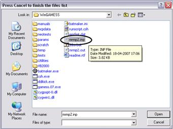 Step 3: Choose the input file for GAMESS. It should have the .inp extension. In this case we choose as an example "mrmp2.inp"