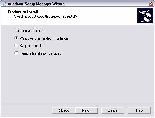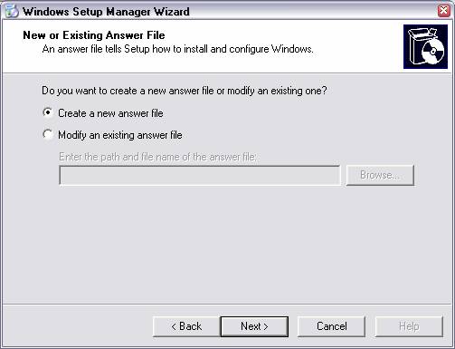 Create or Modify the Answer File - Since this is going to be your first answer file, select "Create a new answer file" and click next. Once you have created an answer file successfully, you can edit it with the Setup Manager by selecting "Modify an existing answer file" and providing a path to it.