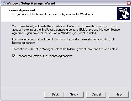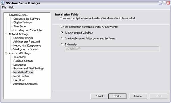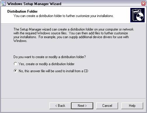 Distribution Folder - Select "No" because we will be installing from a CD. Once again, after you have got this down you can play with the other options. If you wanted to install from a network share, you would choose to create a distribution folder. The distribution folder option gives you the flexibility to add other files as well, such as drivers not found on the Windows XP CD.