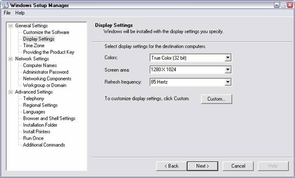 Display Settings - Everyone is different when choosing display settings. Put in what you most commonly use here. If you're not sure what your video card and monitor supports, just choose Windows default. If you try to over do it you may run into problems later. Remember that running a monitor at a refresh frequency that it does not support can damage the monitor. Once again, if you're not sure just set it to Default.