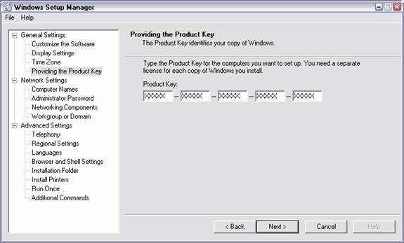 Product Key - This is a handy one. Put your Product Key here. Have you ever lost your Product Key? You can't install without one. Saving it to the answer file will automatically put it in for you. Just don't lose the floppy that you are putting it on. I'm not showing mine here for obvious reasons.
