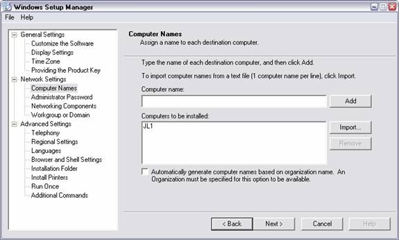 When you enter multiple names during the setup process, Setup Manager automatically generates the Uniqueness Database File (UDF) that is required to add those unique names to each computer during setup. If the administrator imports names from a text file, Setup Manager converts each name to a Uniqueness Database File. The administrator can also set an option to generate unique computer names.
