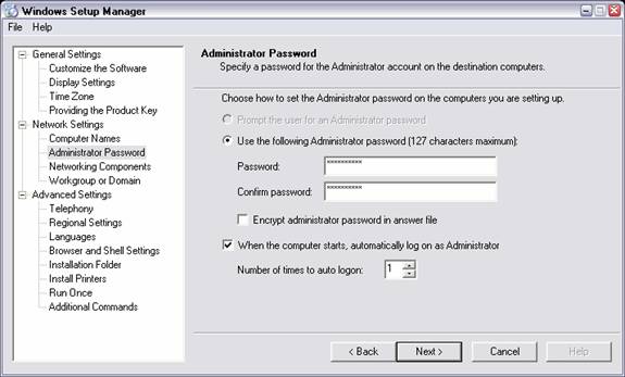 Administrator Password - If you don't want someone to look at your answer file to figure out what it is tic the Encrypt password box. You can also specify the number of times it allows the computer to auto logon as the Administrator. I choose "1" because there are certain settings I change that can only be done by being logged on as "Administrator". Let me stress that a user with administrative rights is not the same.