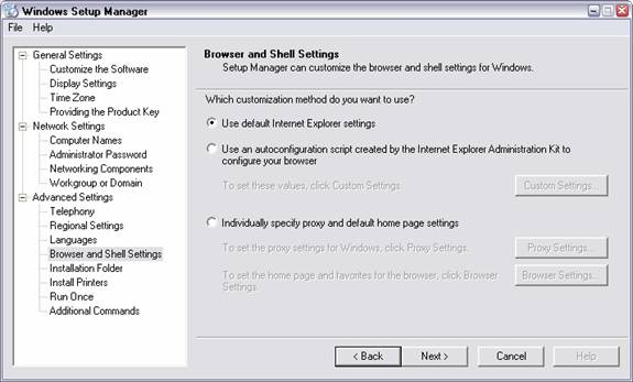 Browser and Shell Settings - Here we have three choices. For the method we are using now, we really only have one choice. Default Internet Explorer settings is the only one we can use because the other two require a distribution folder to be made. We chose to install from the CD instead. Even though you can set the others up here, it will not work without creating a distribution folder.