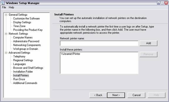 Install Printers - Here's an example of how you would install a network printer if it was not hooked directly to the machine you are going to install the OS on. If the computer that my printer was on was named "Jeramie", I would use \\Jeramie\Printer as my "Network printer name". In order for it work you would have to make sure that Printer sharing is enabled on that computer. To do this, go to that computer and go to Start/Control Panel. Then open Printers and Faxes. Right Click on Printer and select sharing from the menu. In the Sharing Tab make sure you have Share this Printer ticked and make sure the "Share Name" is the same as in the answer file. For example I used "Printer" which is what Windows uses by default. Name it what ever you want but make sure the names match. You could do the same for a fax machine. In the answer file it would look like this \\Jeramie\Fax.