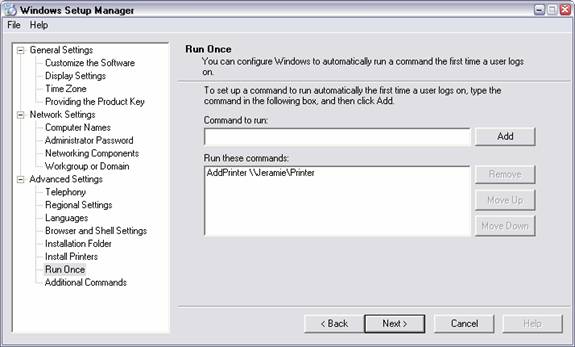 Run Once - As you can see in the Run Once section it has all ready set up the command to add the printer. There are other commands you could use here also. In the answer file I am creating here I would be setting up the disk partitions manually. If you wanted to have the answer file do it for you, you would add the command for it here also. This would require you to create a new batch file. Once again, you can make this as simple or advanced as you like.