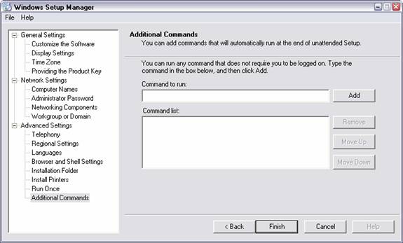 Additional Commands - This is somewhat more of an advanced feature. It allows you to have setup install things that you would normally want to install right after Windows XP. If you desire to venture into it and what it can do for you, Creating a Combination Installation is an example of one way to use this. This would require you to choose different options in the setup manager than we did here. For this article we are going to leave it blank. Now click Finish.