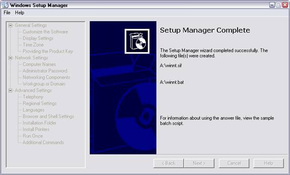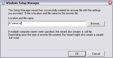 Setup Manager Complete - Congratulations! You have now created your first answer file. Here it is telling you that it has created two files for you.