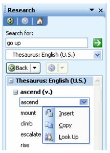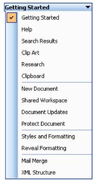 The Task Pane is an interactive menu that opens inside Word and provides users with shortcut commands. It is divided into 14 sub panes; you can switch between the sub panes by just clicking on drop down arrow found next to the Task Pane name and select the name of another sub pane.