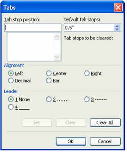 The Alignment section specifies the position from which you want text to continue. o Left places all additional text to the right of the tab. o Center centers text from the tab stop position. o Right places all additional text to the left of the tab. o Decimal aligns all text at the decimal point. o Bar creates a bar at the tab point for dividing text. If you want to add a leader, select any of the leader style found under Leader section, and click on the OK button. |