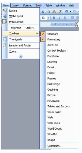 Viewing or Hiding Toolbars Many toolbars, displaying shortcut buttons, are also available to make editing and formatting quicker and easier. From the Menu bar, select View > Toolbars to see the list of all toolbars available inside Word. Click on the name of the toolbar that you wish to view or hide, and the toolbar will be automatically displayed or hidden inside Word document, depending if it was initially checked or unchecked. |