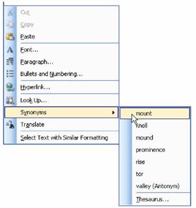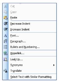 Shortcut Menus Shortcut menus allow you to access various Word commands faster than using the options on the Menu bar. While working within your document, right-click on the item you want to work with and a Shortcut menu will show. The options displayed in the Shortcut menu will vary depending on the element that was right-clicked. For example, the Shortcut menu shown in the adjacent figure was produced by right-clicking on a Bullets list. Actions such as Decrease 11311x239l Indent are only applicable to lists and therefore appear only on the Shortcut menu of the Bullets. |