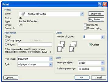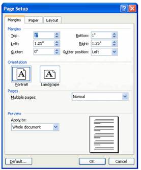 Margins represent the white empty boundaries formed around the paper inside a Word document. Margins can be user-defined and changed at any time. To change the margins measurements: From the Menu bar, select File>Page Setup, the Page Setup dialog box will open, choose the Margins tab. Under Margins section, enter a When finished, click OK. |