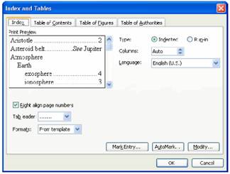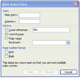 at the bottom of the tab page to open the Mark Index Entry dialog box.