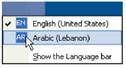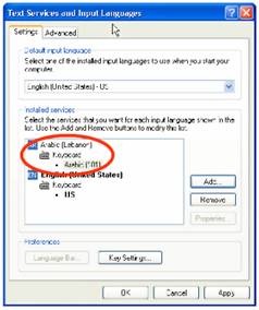 Select Languages tab and click on Details Click on Add button and select Arabic Click on Key Settings button and a message Do you want to apply the keyboard layout changes now? Click Yes, then an Advanced Key Settings dialog box will appear click OK Click on Language Bar button and from the From the Text Services and Input Languages You should have the Language Bar added on |