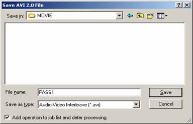 Here, select the folder and type in the name of the small avi file to be produced during the first pass and check "Add operation to job list and defer processing". Click "Save" and go back to VirtualDub.
