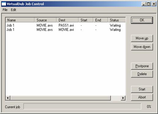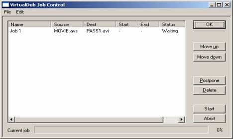 Press F4 to bring up the VirtualDub Job Control window (If you are doing two passes together without interruption, it will be like that):