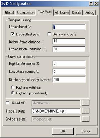 In the "Two Pass" tab, do NOT touch anything in "Two-pass tuning" area.In the "Curve compression" area, set both "High bitrate scenes %" and "Low bitrate scenes %" to 0 (to get a linear-scaled curve). "Bitrate payback delay (frames)" default 250 is fine here. Also, you can choose either "Payback with bias" or "Payback proportionally". I prefer to use "Payback proportionally". Leave the rest as is and again do NOT check Hinted ME.