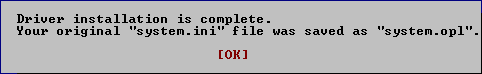 The following dialog box informs you that the installation is complete and the original SYSTEM.INI file was saved as SYSTEM.opl.