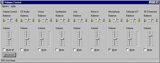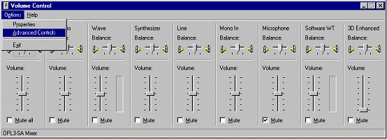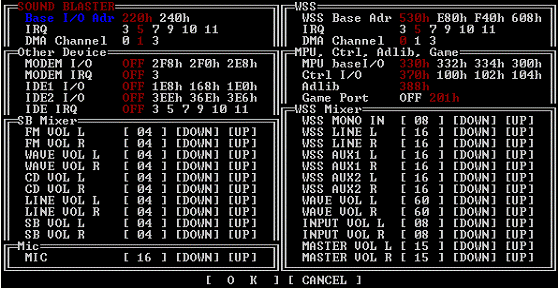 In the SB and WSS Mixer sections, use the left cursor key to raise the volume and the right cursor key to decrease it. If you are using a mouse, click the [UP] and [DOWN] buttons to adjust the volume level.