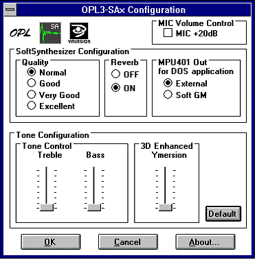 Open the dialog box, and display the information of OPL3-SAx I/O address, DMA and IRQ assigned by Configuration Manager or PnP BIOS. Set the value of master volume that is written into OPL3SA.INI.