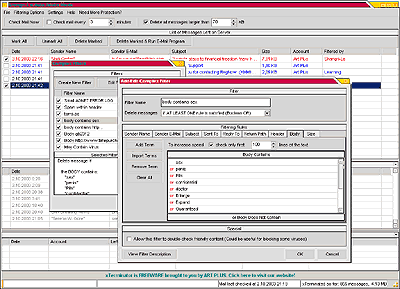 While initial release was optimized to block Sobig.F worm that caused a havoc in August and September, 2003 release 4.2 offers more flexibility to help you fight spam in general. Besides usual filtering methods, xTerminator 4.2 can work in "Friendly Content Only" modes where you can block all messages that are not recognized as a friendly content (know e-mail address or expected message content)!