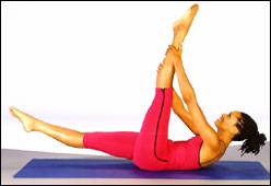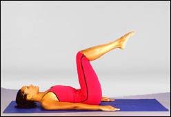 Lie back with knees into chest, neck and chin up, and hold onto left shin with both hands. Extend your right leg up perpendicular to floor and exhale deeply, watching your abdominals contract. Hold here for a few breaths.