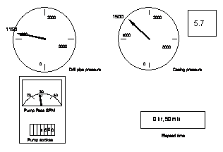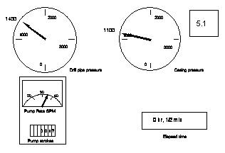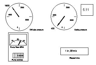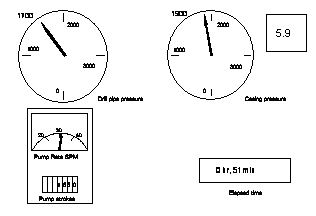Problem 5-9: Increase choke size - back pressure is stalling the pumps. Opening the choke will let the pump pressure drop and let the pump go back to 36 strokes per minute."Everything is OK" could be a correct answer because at this point you are steadily opening the choke and it is hard to keep up.In some cases, especially when a large bubble has intruded, pump rate tends to change because of the rapid change in back pressure against the pumps when bubble and maximum pressure are at the surface. Well killing experts with practical experience advise that adjusting casing pressure to keep drillpipe pressure constant restores the pump to the desired rate. Changing previously established throttle setting here upsets all the parameters. NOTE: Most of the time, when control of kicking well is lost, control is lost at this point because too many things are happening at the same time.