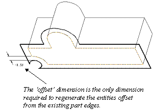 The Offset Edge command creates Sketcher entities offset from existing part geometry. In Figure 1-2, a protrusion similar in shape to the existing part is desired. The entire edge of the part can be selected for use with Offset Edge to create the extruded protrusion shown in Figure 1-3.