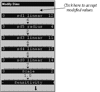 To accept the modified dimension values and close the thermometer menu, click in the box just below the Modify Dims title bar, as shown in Figure 1-18. The middle button aborts changes.