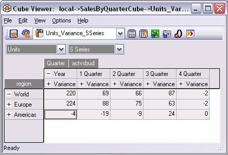 Save the view as a private view under the name: Units_Variance_SSeries. (Private views are available only to the user who created them. In contrast public views are available to all users on a remote server who have at least Read access to the associated dimensions. Only a TM1 administrator can create public views.)