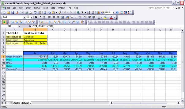 We return to the TM1 Server Explorer and open the Cube Viewer for the SalesCube. Here open the saved view Default_Variance. Then click on the icon for snapshot or File→Snapshot. The following Excel worksheet appears: