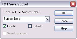 TM1 asks if you want to overwrite the existing subset definition. Please press No. Then write in the white array Europe_Detail and set a checkmark in front of private. Confirm with OK.