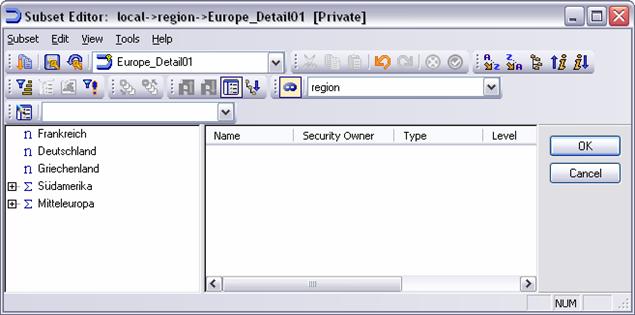 Open the TM1 Server Explorer by making a double-click on the dimension region. Then TM1 opens the Subset Editor.