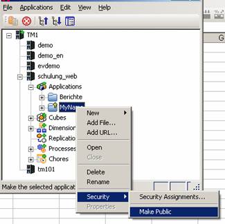 Switch to TM1 Perspectives, rename the new application as GuV5D_Umsatz_Europe_Q1_0405.xls and make it public