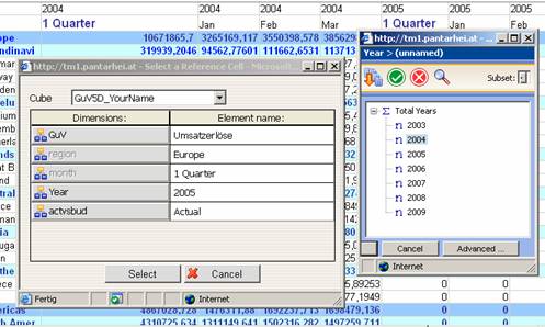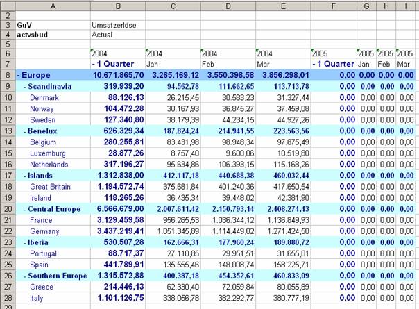 If you want to use the present sheet to calculate, for example, sales revenues (Umsatzerlöse) for the region Europe for the 1. Quarter of 2005, based on the values of the previous year: