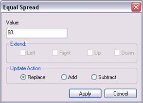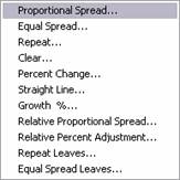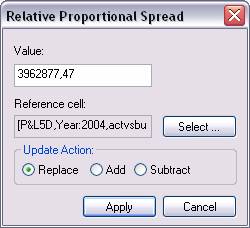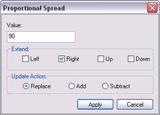 The Proportional Spread dialog box appears. Enter the value you want to spread in the Value field. If necessary, select Extend options to specify the direction for the data spread. In the majority of cases the direction is right. This depends on how you define your views. It is possible to replace existing values, as well as adding and subtracting from these values.